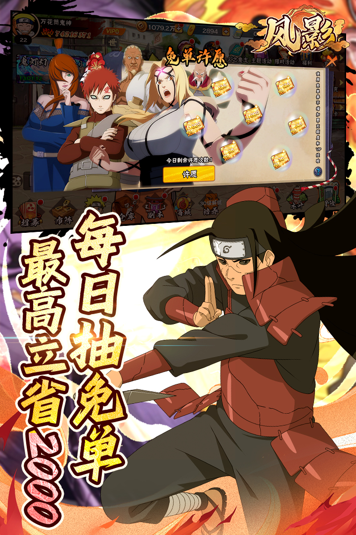 风影(五千抽免单0.1折)是一款高度还原火影 IP 的横板卡牌策略手游,登录可领五星英雄,连续登录八日还可领大量抽卡券与稀有资源!升级即享海量铜币与进阶石,轻松突破战力瓶颈。收集百位忍者,体验多元养成;核心英雄5000连抽、高爆率掉落,快速组建强力阵容!福利拉满,成长加速,快来体验这款福利超多的火影卡牌手游,书写你的忍界传奇!