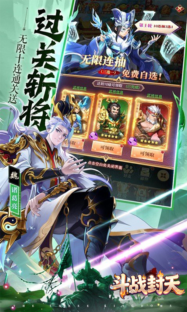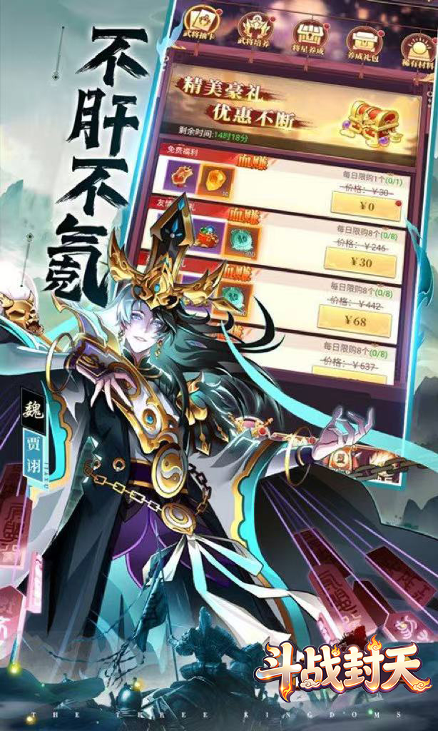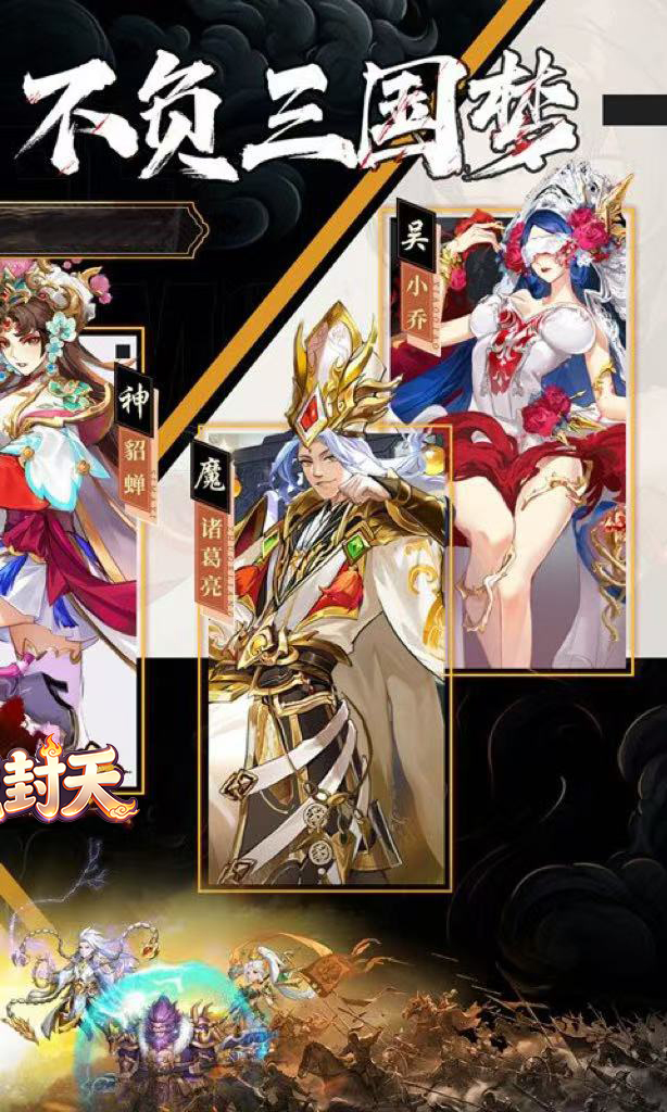 《斗战封天》是一款策略卡牌挂机手游,七日签到领强力神魔粉将,以及十连无限抽,助你0氪也可畅玩三国。在游戏中,玩家将重回三国时期化身一国主公,你需要招募三国名将,并根据自己的喜好来搭配养成,以及利用九宫格阵法站位以弱胜强,最后一统整个三国。 同时游戏内设计了超多三国英雄角色,如关羽、张飞、诸葛亮、吕布、曹操等,他们各自有着不同的定位和技能,合理搭配阵容,才能取得对战的胜利。游戏内所有养成资源都可以免费获得,玩家不花钱也能轻松养成所有角色,快来叱咤风云,独霸三国吧!